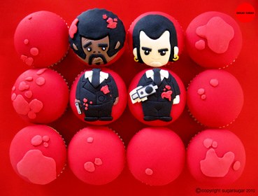 As my husband's birthday quickly approached and I found myself swamped with cakes, I went online in search of something to show him that he deserves cake love too! I found these amazing Pulp Fiction cupcakes that featured Samuel L Jackson and John Travolta, and I had to re-create them!